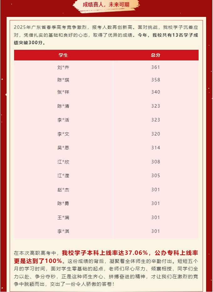 以上就是“ 廣東省高新技術高級技工學校 | 2025高職高考錄取戰績曝光:深職大+74.8%公辦率+37%本科線!”的全部內容,文章內容僅供參考。更多廣東中職中專技工招生信息、廣東中考資訊,廣東技校資訊,可以點擊【在線報名系統】獲取專業老師指導,我們會安排專業老師與您聯系,提供一對一報名咨詢服務。
